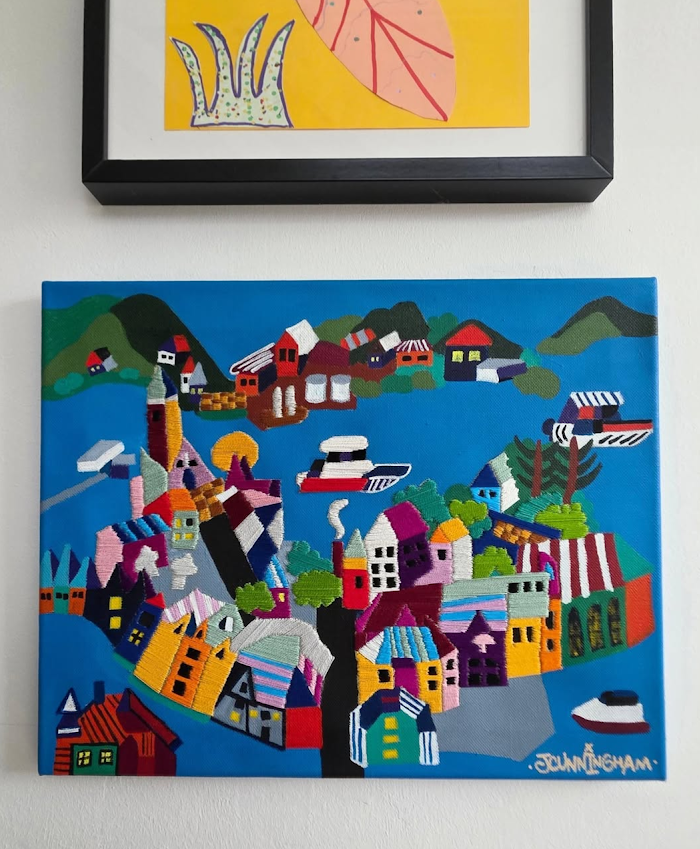 “Joel's embroidered painting "Spanish Hills" is a treasure in our home. It fits perfectly with our aesthetic, adds a little urban whimsy, and serves as a window to a memory of our own travels to Barcelona.”