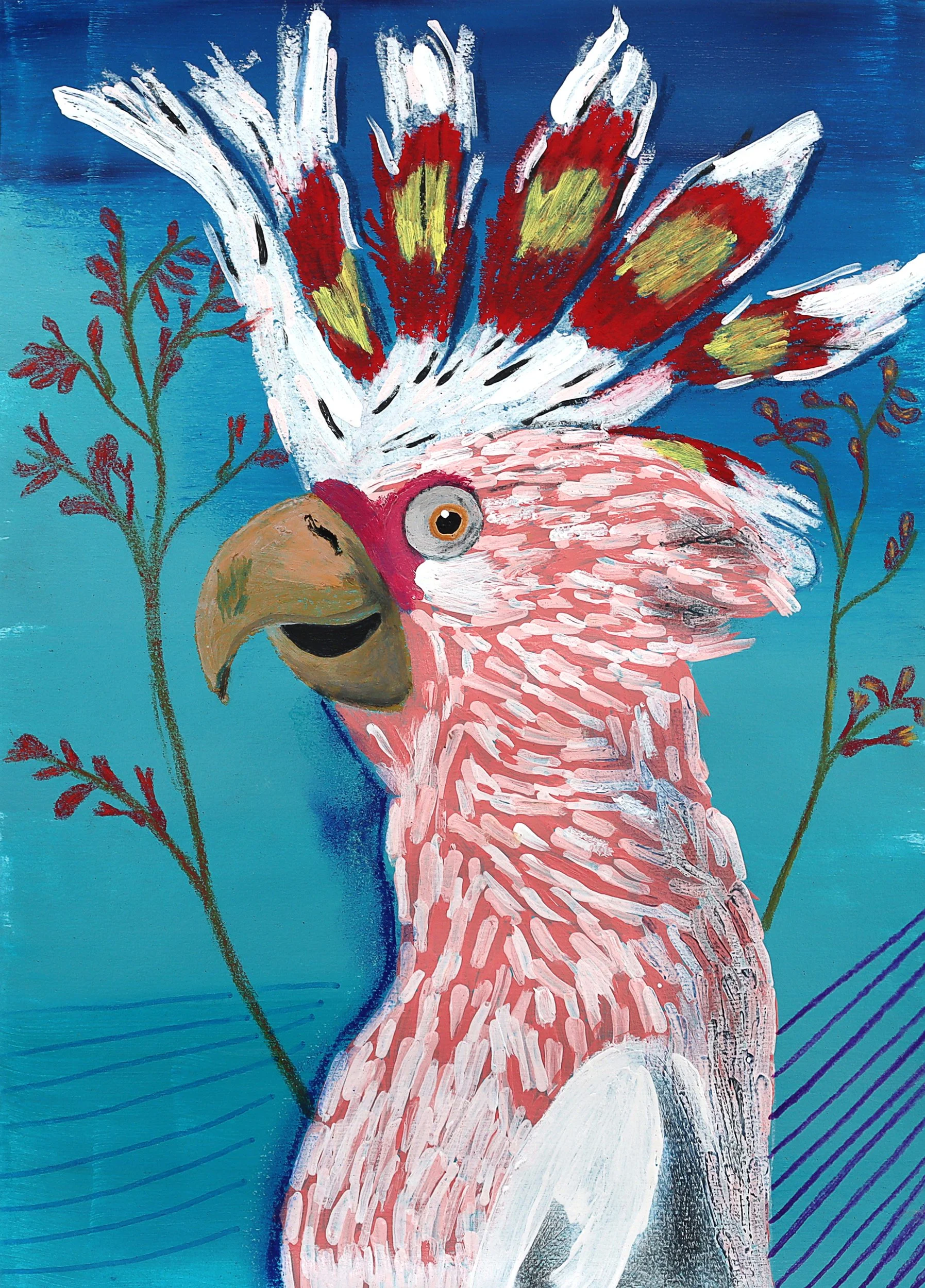 Pink Cockatoo with Kangaroo Paws (2022), Mixed Media on Paper, 29.7 x 42 cm