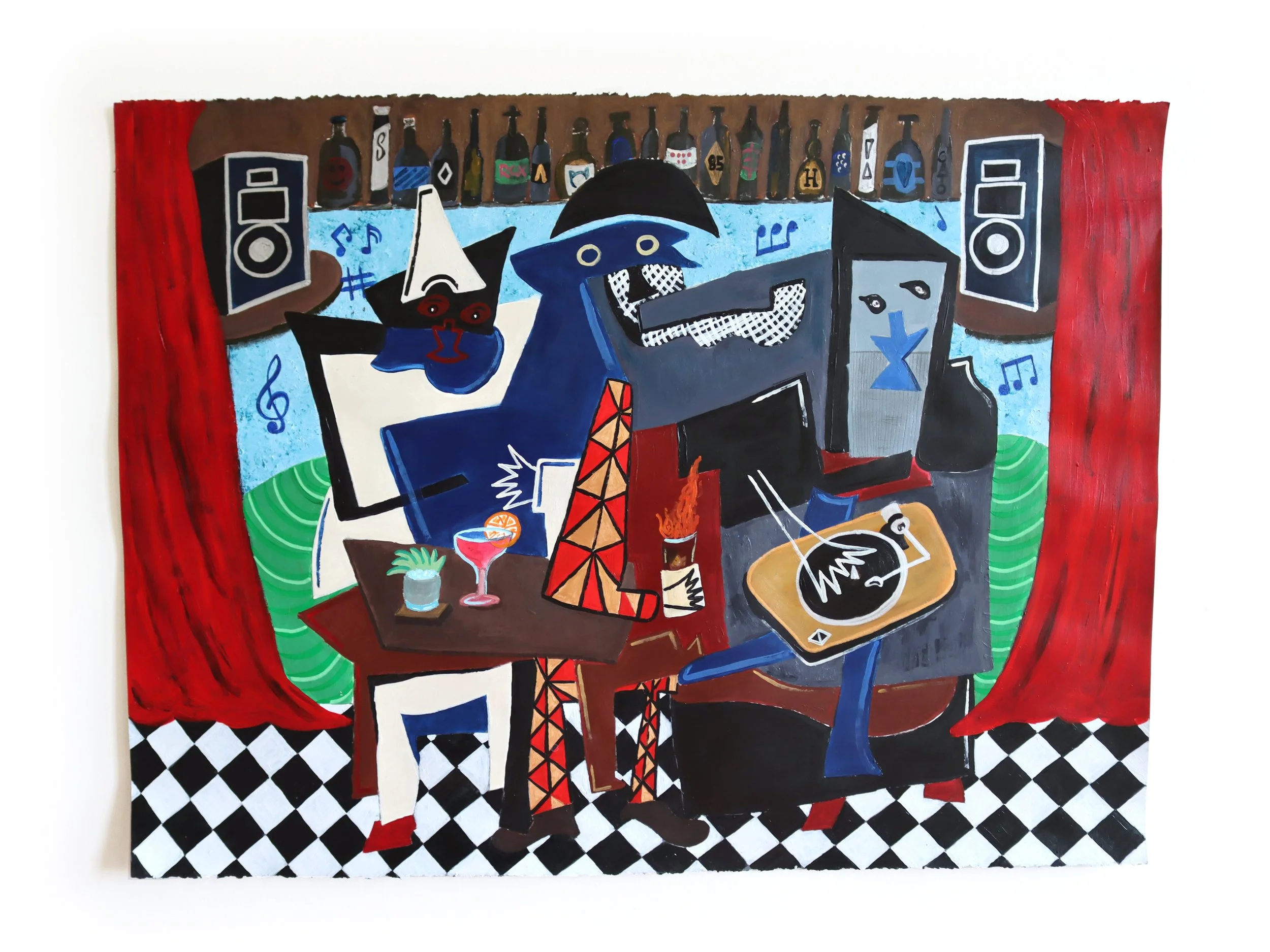 3 Bartenders (after Picasso’s 3 Musicians) (2025), Mixed Media on Paper, 76 x 57 cm